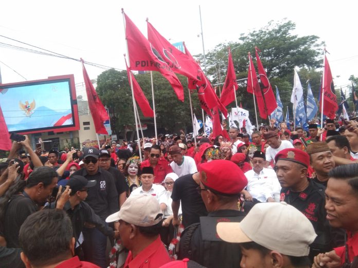 Sekitar pukul 09.00 WIB, rombongan bergerak menunju kantor KPU. Eri Cahyadi beserta istri serta wakilnya Armuji nampak menaiki becak dan mendapat pengawalan dari ribuan orang.