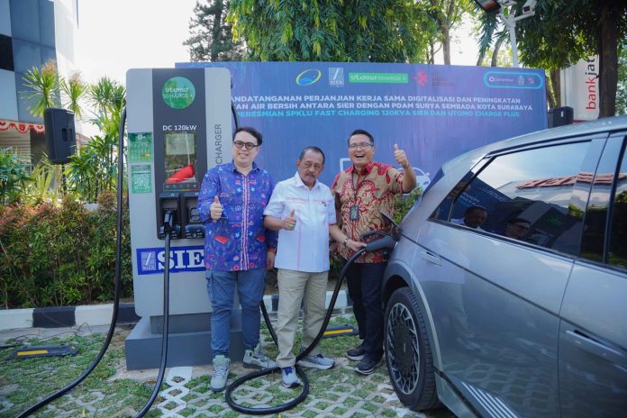 Lsatu.net, Surabaya – Direktur Surabaya Industrial Estate Rungkut (SIER) Didik Prasetiyono mengungkapkan, pihaknya menggandeng perusahaan Utomo Charge Plus, mempersembahkan Electric Vehicle (EV) Charger atau stasiun pengisian kendaraan listrik umum (SPKLU) fast charging 120 KVA.