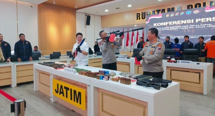 “Kasus ini hasil pengembangan dari penangkapan sebelumnya yang dilakukan oleh Polda Papua. Kemudian dari penyelidikan yang dilakukan di Papua, kami berhasil mengidentifikasi pemasok senjata yang berada di Bojonegoro, Jawa Timur,” ujarnya di Mapolda Jatim, Selasa (11/3/2025).